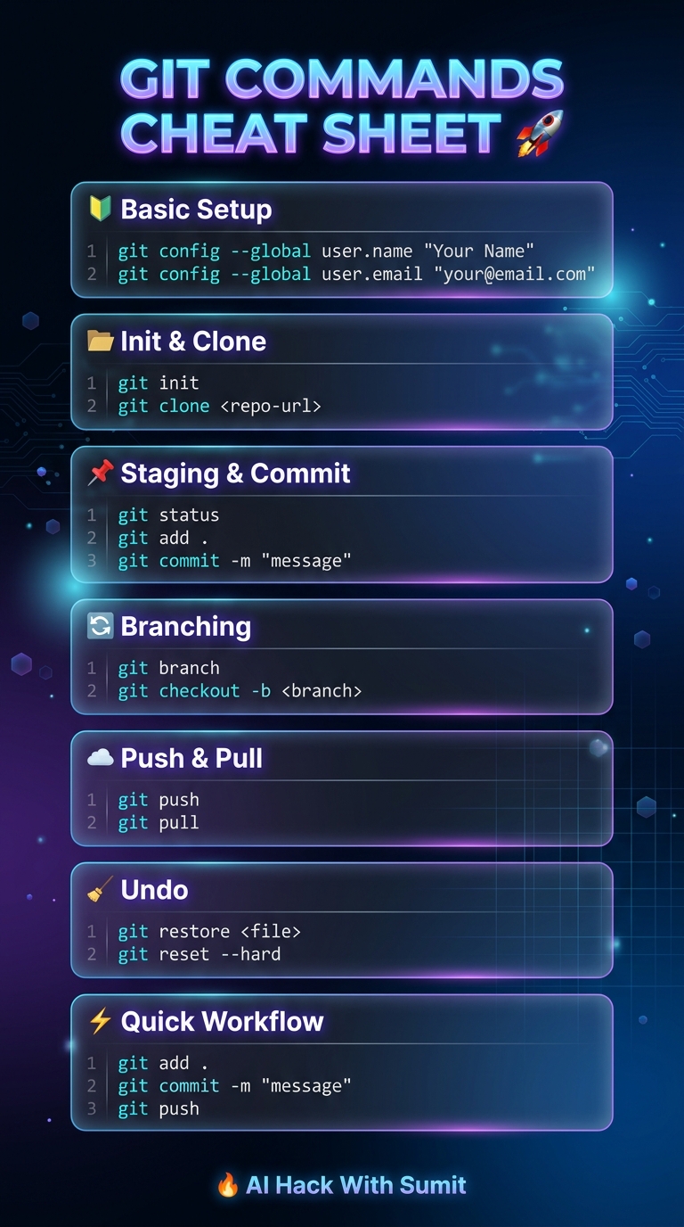 Visual Git commands cheat sheet covering branching, merging, rebasing, stashing, cherry-picking, and advanced Git workflows. Must-have reference for developers working with version control.